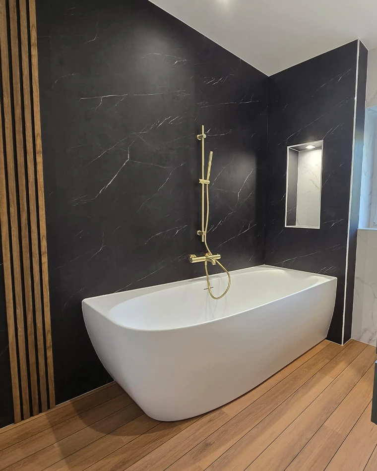 Nous avons installé une baignoire d’angle et créé une niche pose produit.