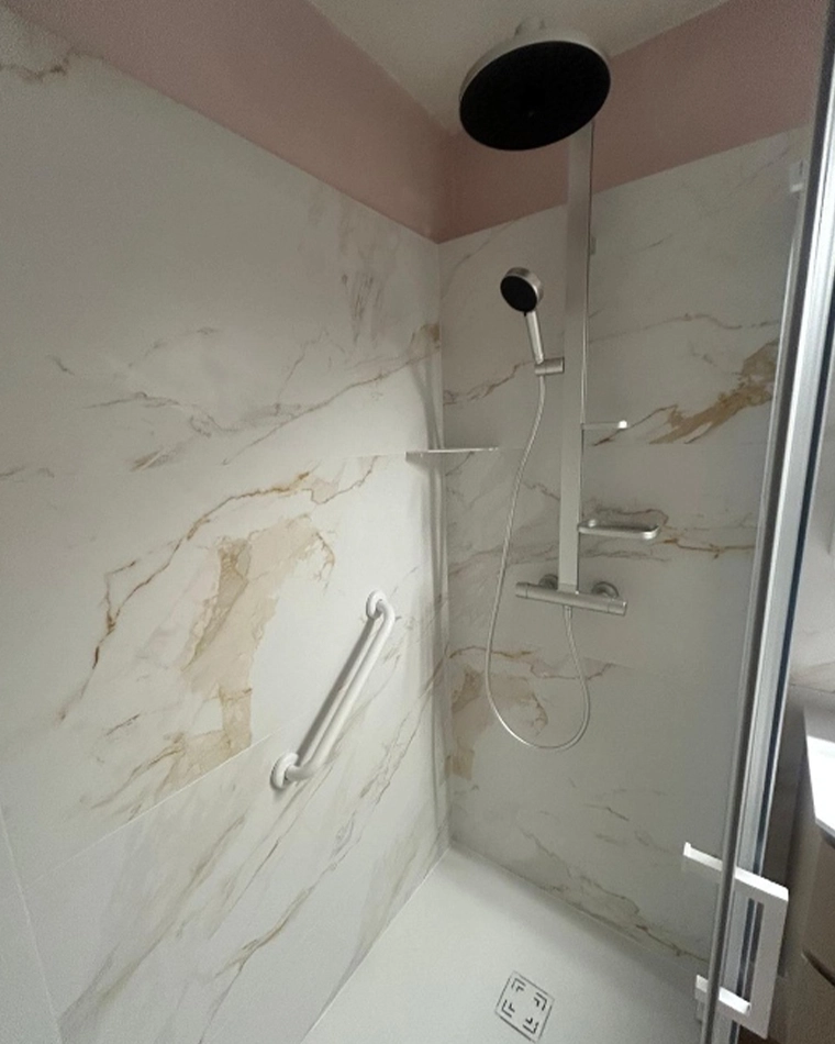 Nous avons répondu à la demande du client en installant un receveur de douche extra-plat antidérapant avec une paroi fermée et porte coulissante, et en intégrant un meuble vasque aux bords arrondis, coloris Macchiato, alliant confort, sécurité et design.