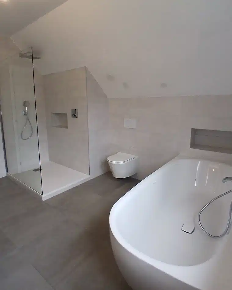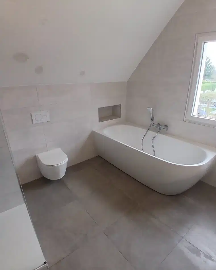 Le client souhaitait une grande baignoire, une douche plus lumineuse et facile à entretenir, ainsi qu’une touche d’originalité dans le mobilier.