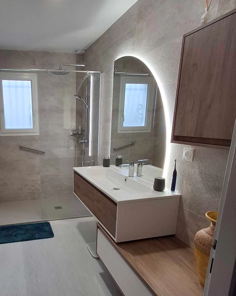 Notre client souhaitait rénover sa salle de bain en privilégiant l’espace douche, avec un receveur plus grand et une meilleure luminosité. Il souhaitait également un ensemble meuble et miroir plus moderne.