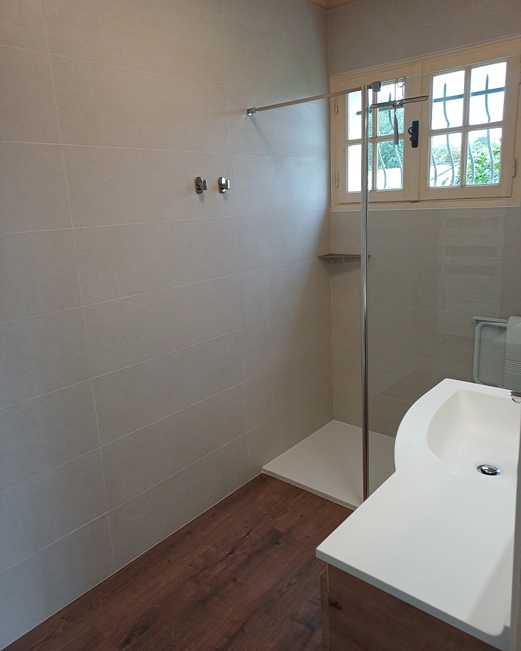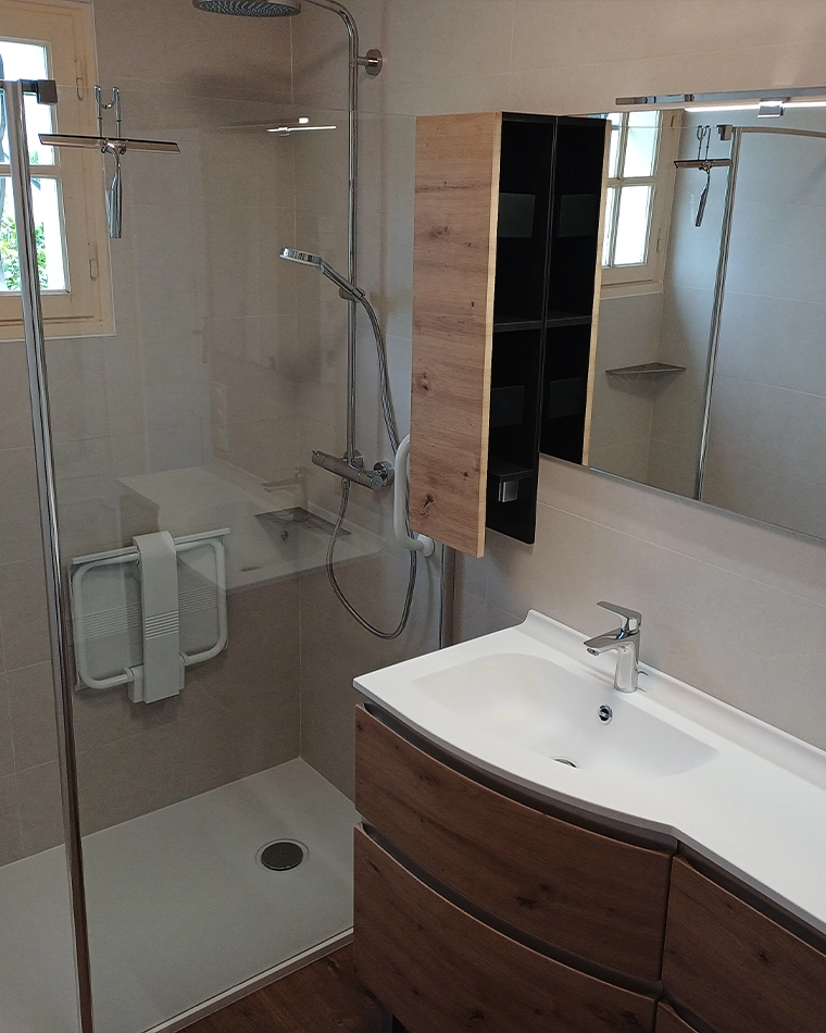 Intégration d’une étagère inox dans les joints de faïence, mise en place de patères, d’un siège et d’une barre de de douche.